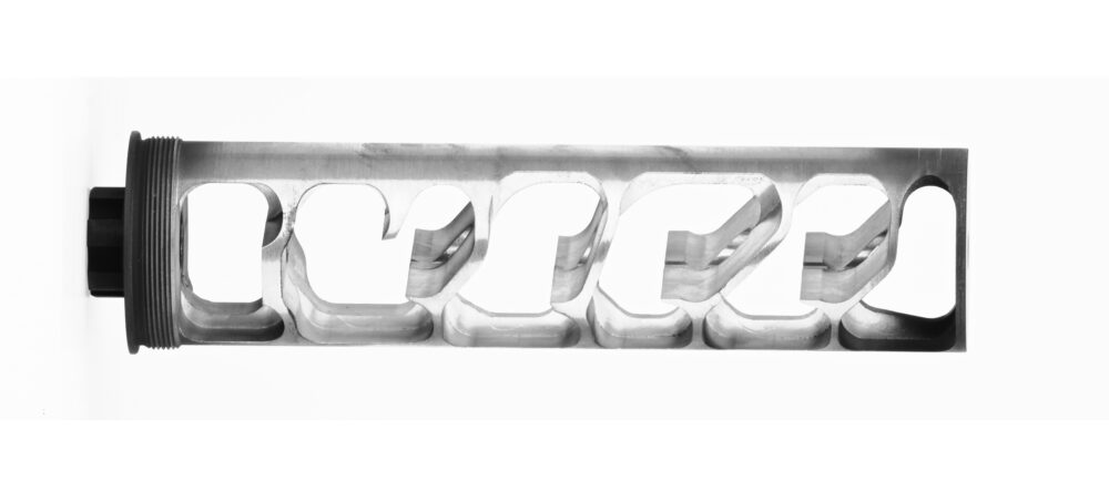 Monocore type silencers usually have great alignment, but the Constitution 2 takes it to the next level. The bore through the silencer, threads, and the thread shoulder are all done in the same machine, same setup, at the same time. This completely eliminates stacking tolerance issues from multiple parts being assembled together. As a result, the Constitution 2 mounts straight and concentric, and securely stays that way over hundreds or thousands of rounds.
