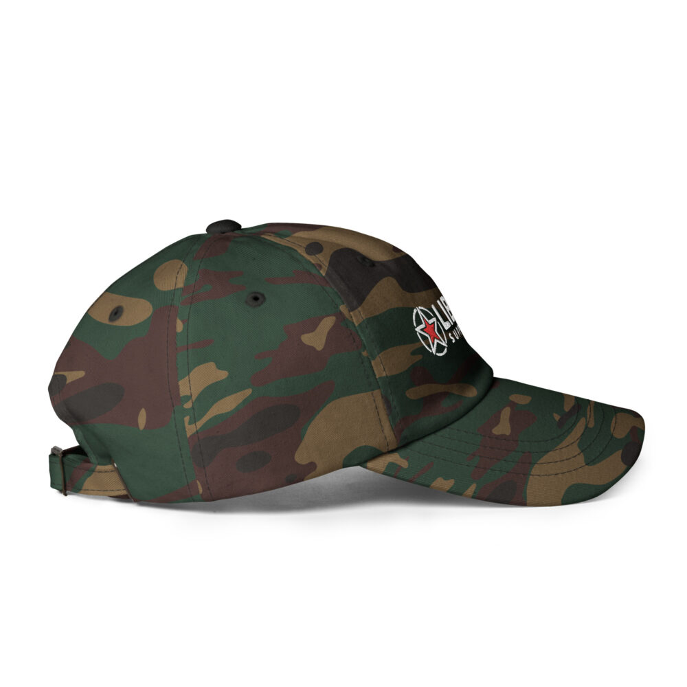 • 100% chino cotton twill • Green Camo color is 35% chino cotton twill, 65% polyester • Unstructured, 6-panel, low-profile • 6 embroidered eyelets • 3 ⅛” (7.6 cm) crown • Adjustable strap with antique buckle